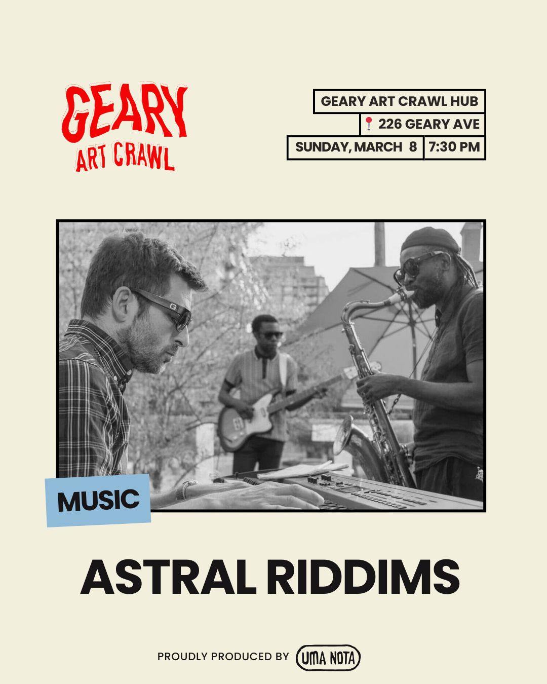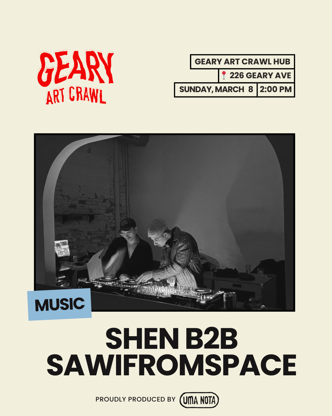 𖡡 226 Geary Ave (Dufferin & Geary)Geary Art Crawl Hub is the central gathering space for music, food, drinks, and community. DJS ✷ LIVE PERFORMANCES ✷ LICENSED BAR ✷ FOOD VENDORS ✷ HOT & COLD BEVS ✷ HEATER STATIONS ✷ PARTICIPATORY ACTIVATIONS ✷ KID-FRIENDLY ACTIVITIES